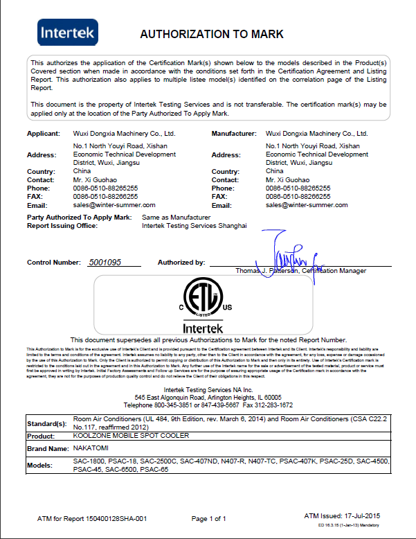 半岛网站web版登录入口-半岛平台(中国)近日宣布公司移动式工业冷气机获得的质量与安全第三方机构天祥实验室(世界上规模的消费品测试、检验和认证公司之一)颁发的ETL认证。